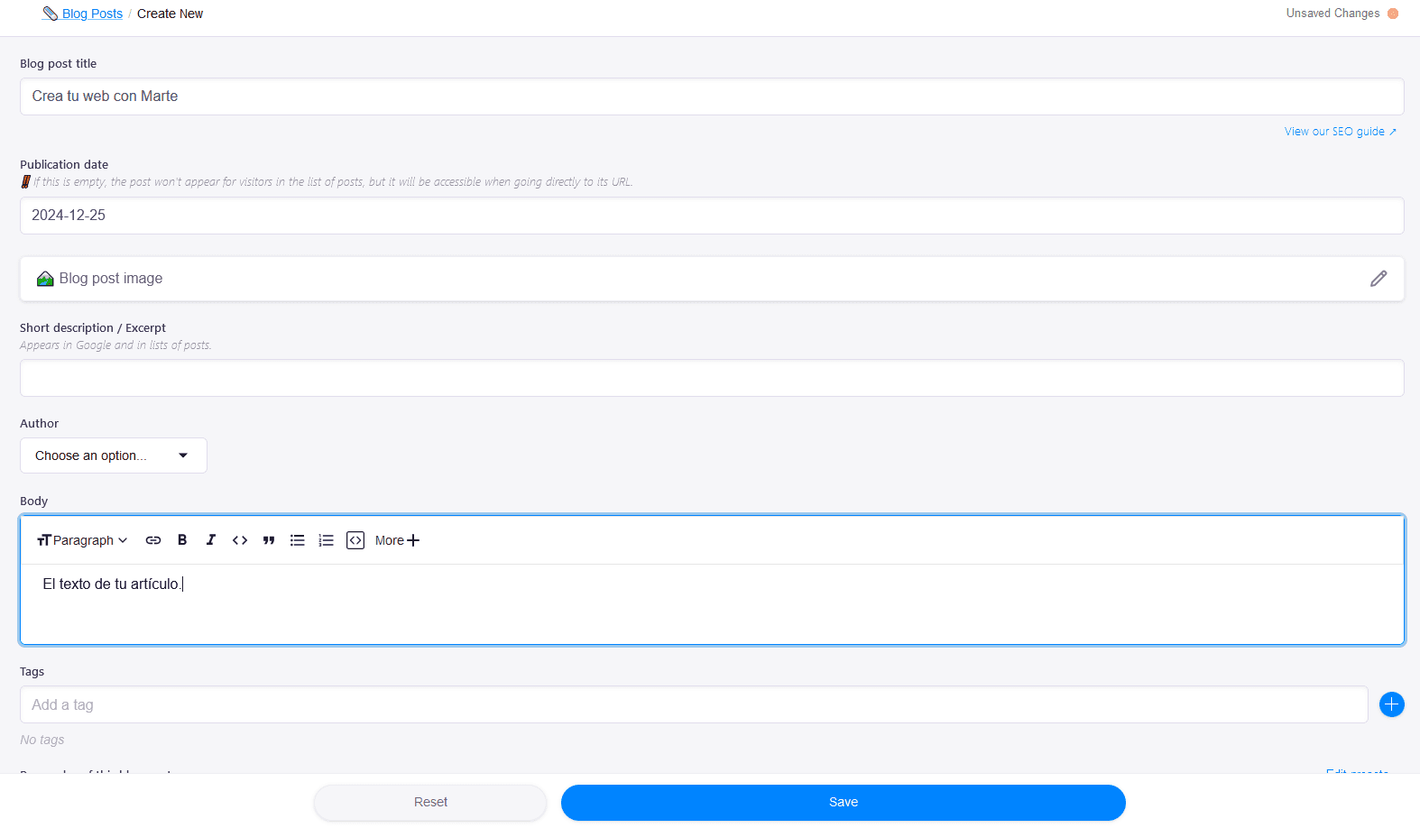 - Título: Escribe el título en "Blog post title".
